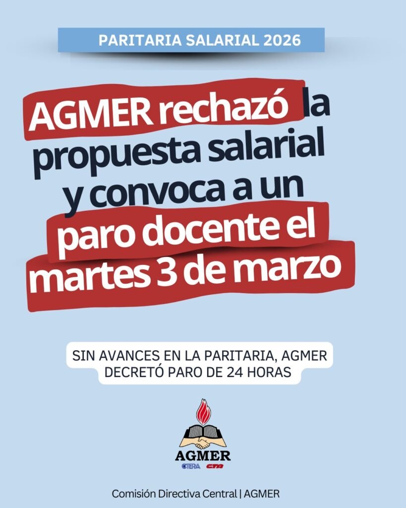 Se ejecuta para MAÑANA, MARTES 3/03, PARO DE 24 HS resuelto por el CONGRESO EXTRAORDINARIO DE AGMER el 23 de febrero en la ciudad de Paraná.