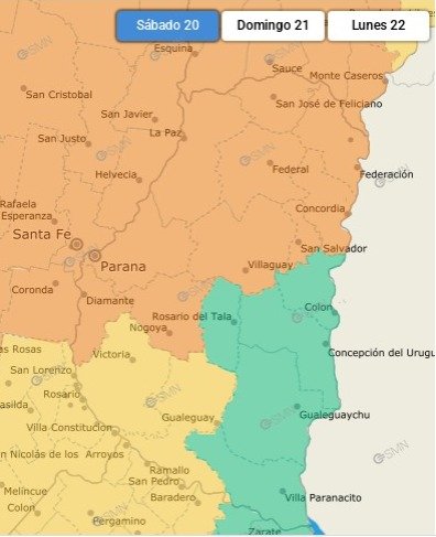 Los departamentos alcanzados por alerta naranja son: Federal, Feliciano, Federación, La Paz, Paraná, Villaguay, Nogoyá, Diamante, Uruguay, San Salvador y Concordia.